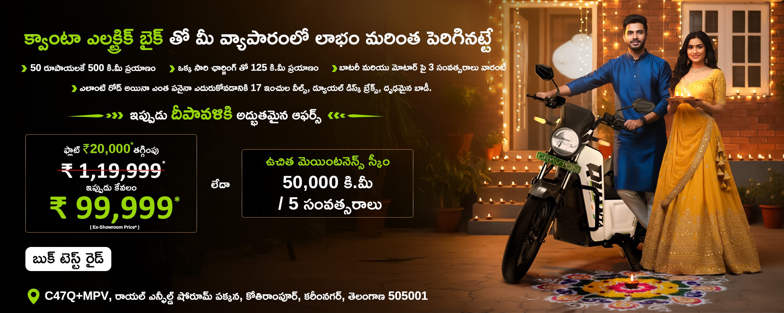 ఈ పండుగలో క్వాంటా బైక్ కొనుగోలుపై తక్షణ ₹20,000 డిస్కౌంట్ పొందండి.
